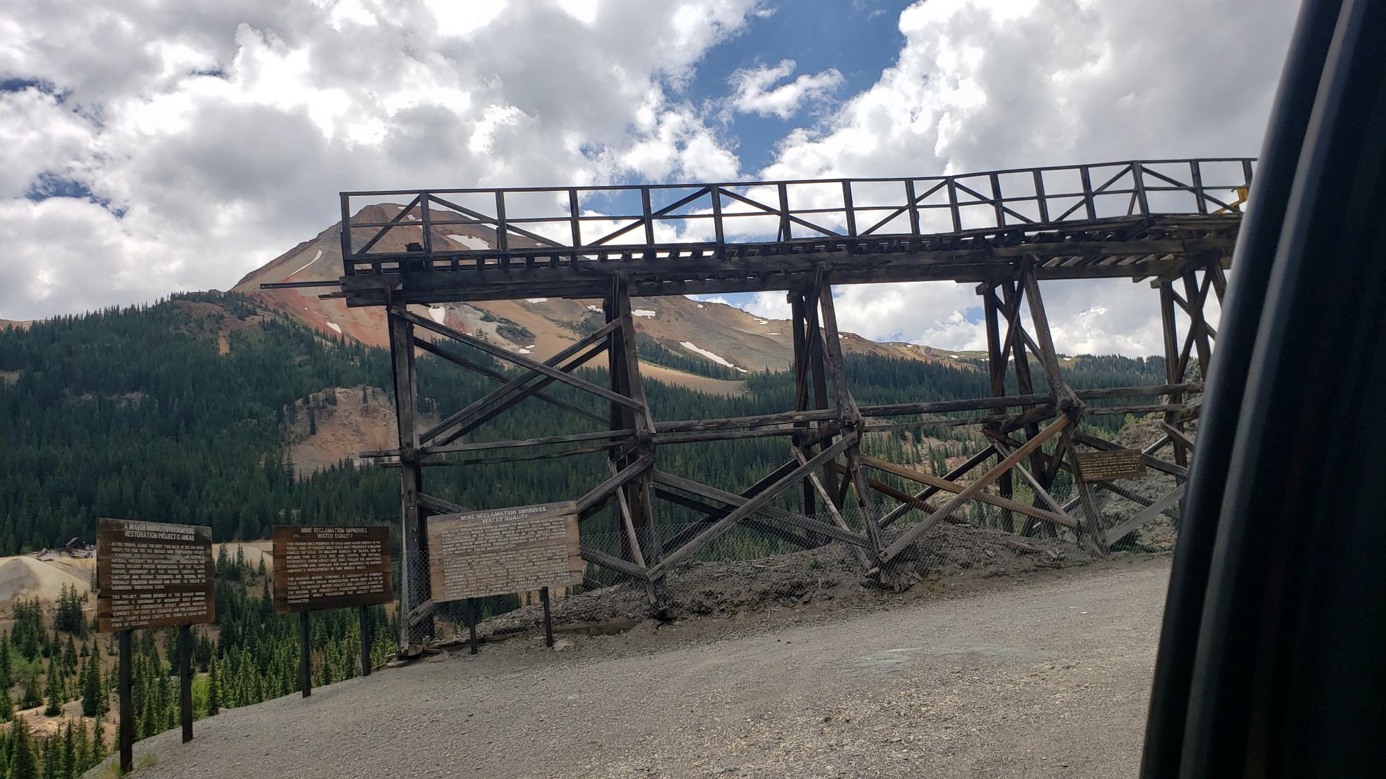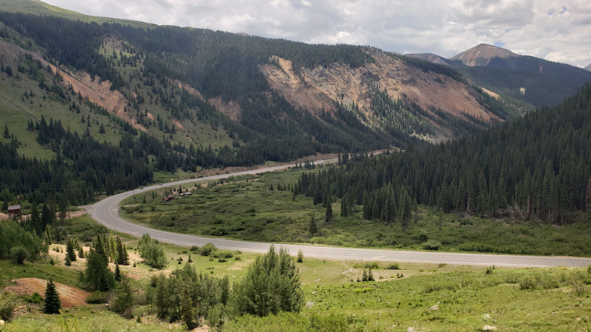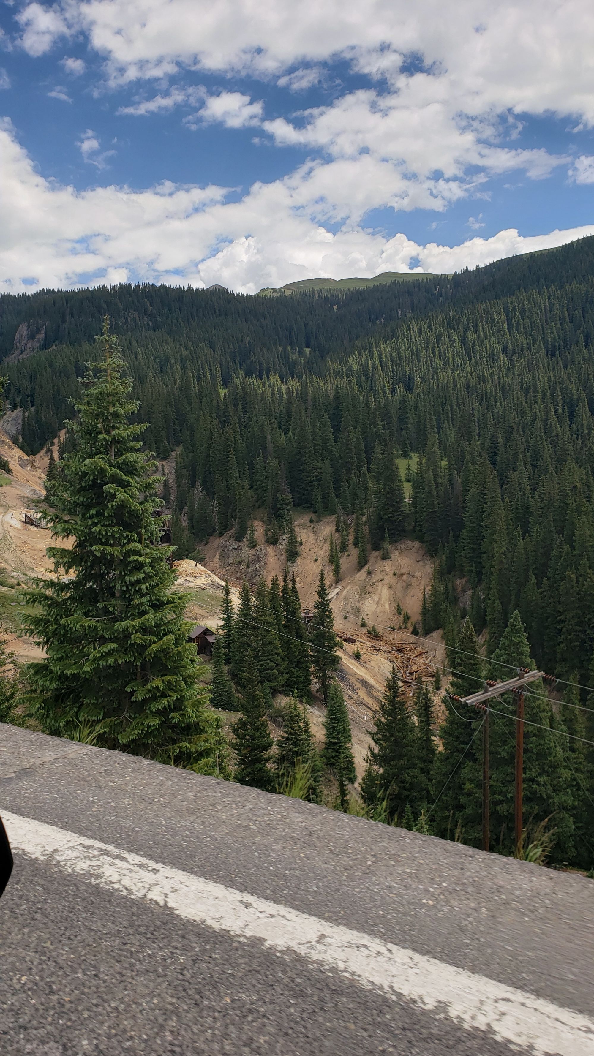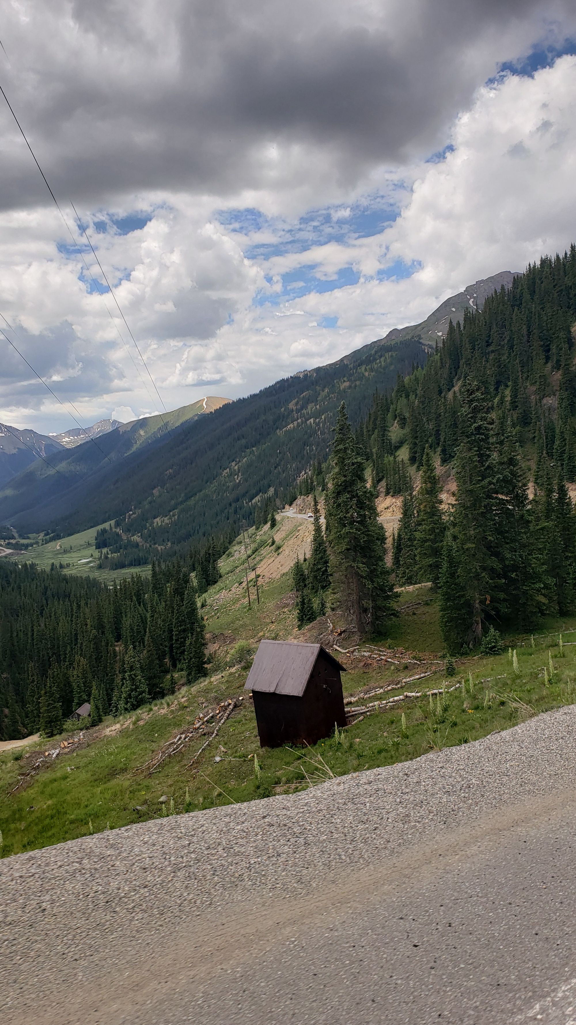 Along the Red Mountain switchbacks heading into Ouray is a turnoff loop where travelers can park to overlook an old mine and some abandoned houses.