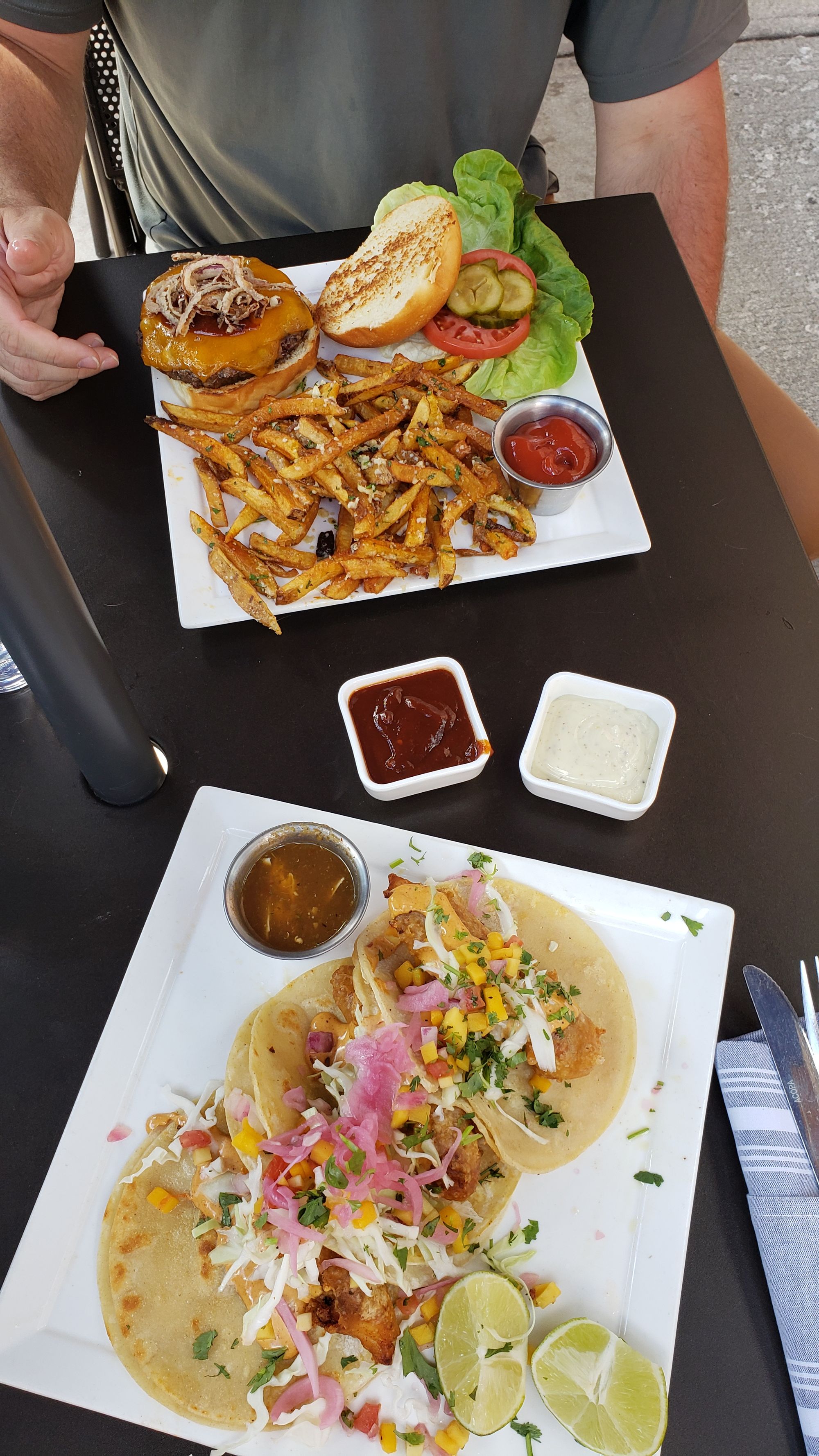 Prices are as expected for a booming tourist town. I think my fish tacos were $15, and about the same for Andrew’s perfectly pink burger.