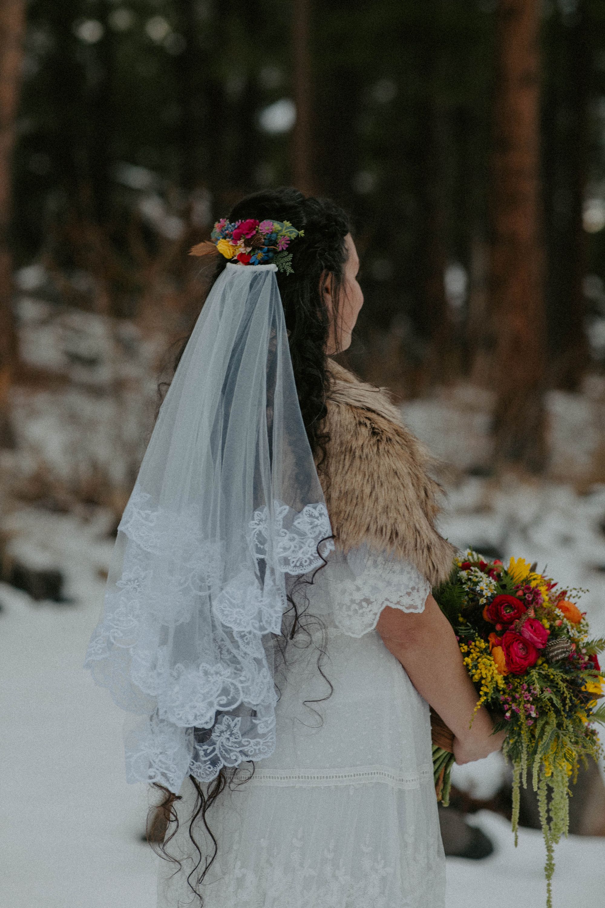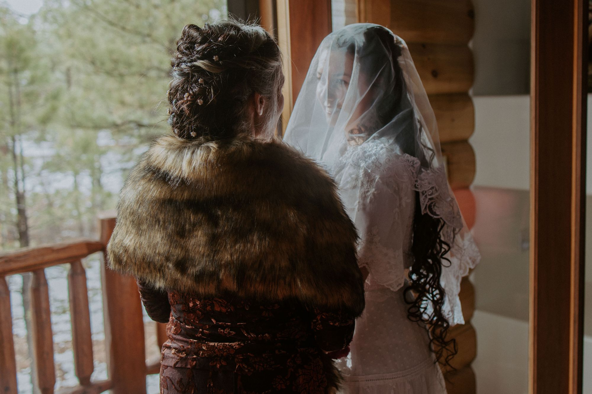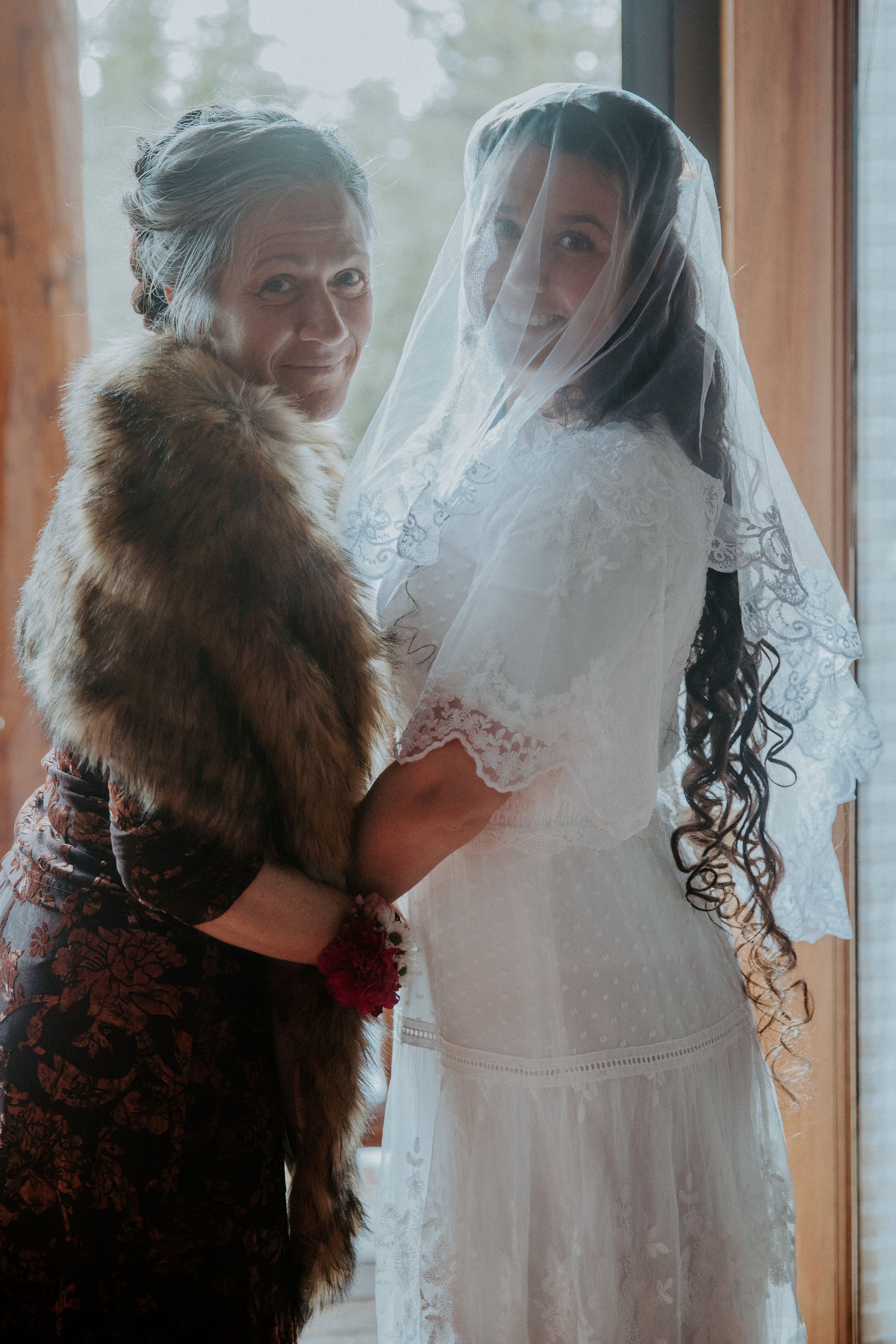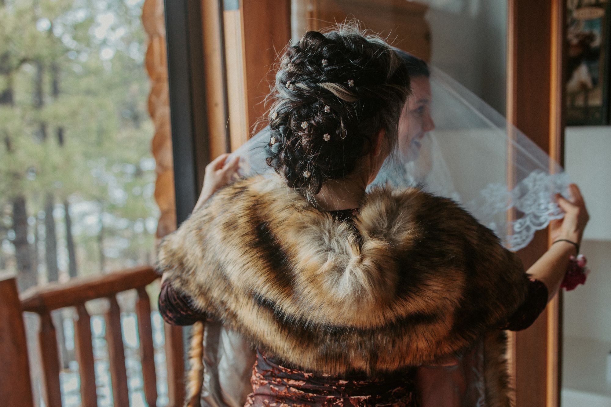My friend Naomi did my mom’s luxuriously long hair for the wedding. To make her feel a little extra special, I bought her a set of pearl hair pins and a gorgeous faux fur stole to match Emily and me.