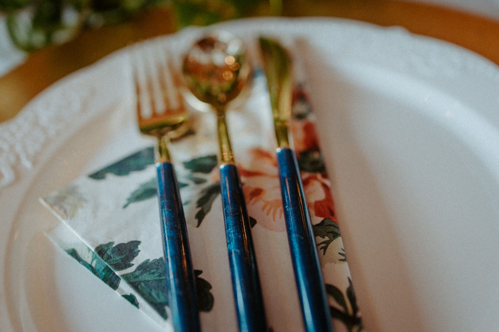 Between thrift finds and another friend’s supply, I came up with 30 gold charger plates. Then I bought 180 Gold Plastic Cutlery with Blue Glitter Handles and plastic disposable white plates with lace-detailed edges. To tie it all together, Emily found these beautiful floral napkins at IKEA!