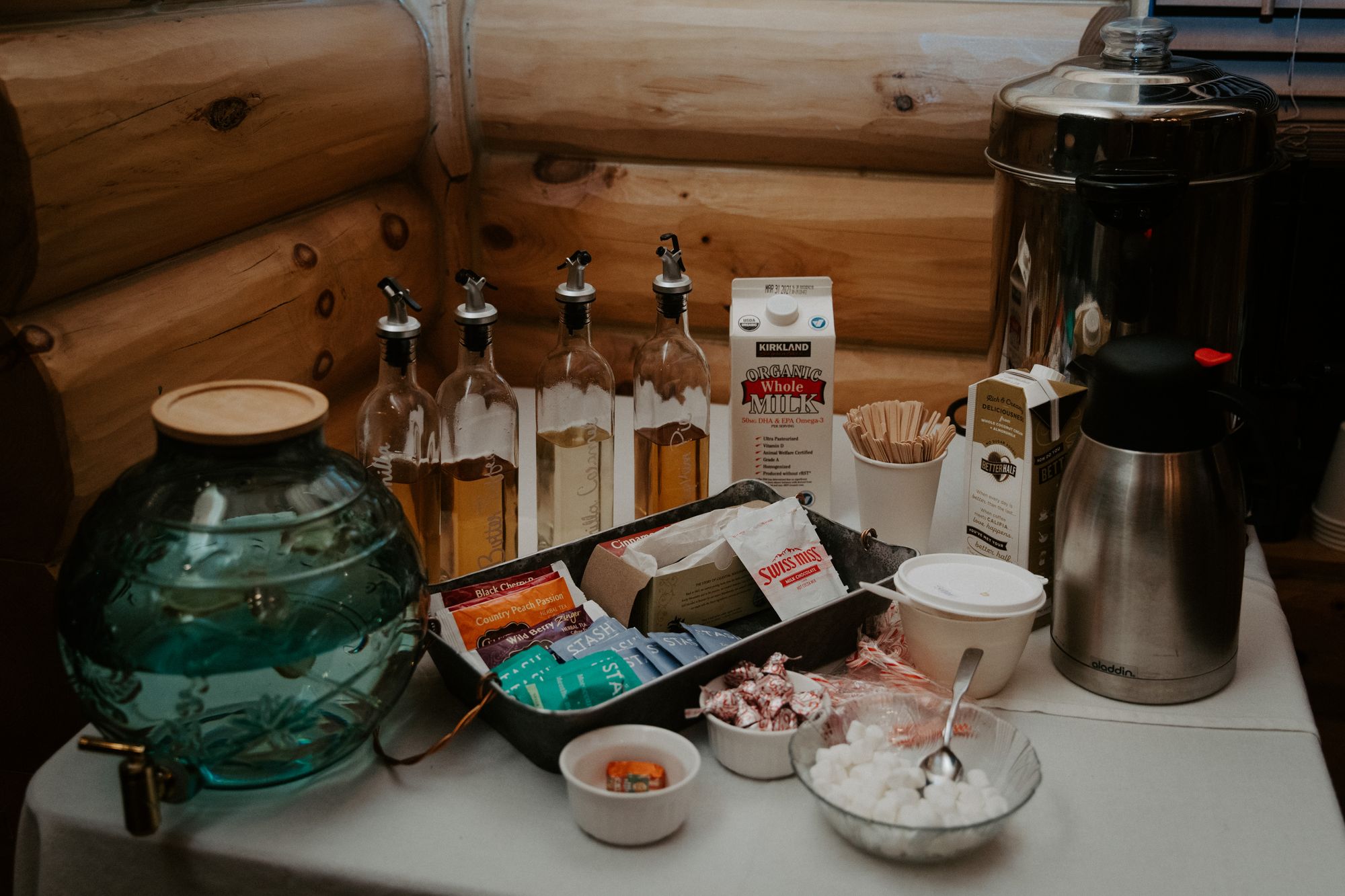 I happened to already have glass beverage dispensers and hot water pitchers. But I borrowed chafing dishes from a friend, as well as a stainless, 45-cup coffee maker from another (similar to this one by Hamilton Beach). Amazon delivered a 50-pack of white beverage cups with black lids and cardboard sleeves. I bought a variety of tea and hot cocoa packets (again, anything unused would just be put in our own pantry).