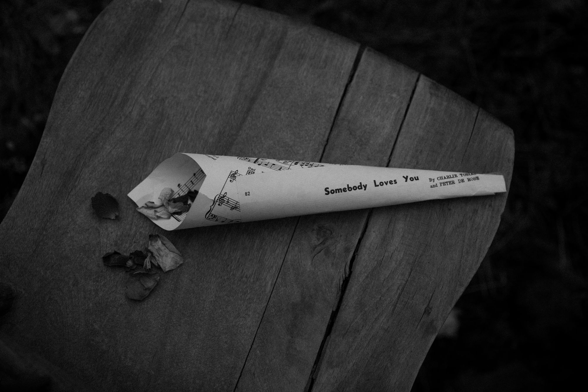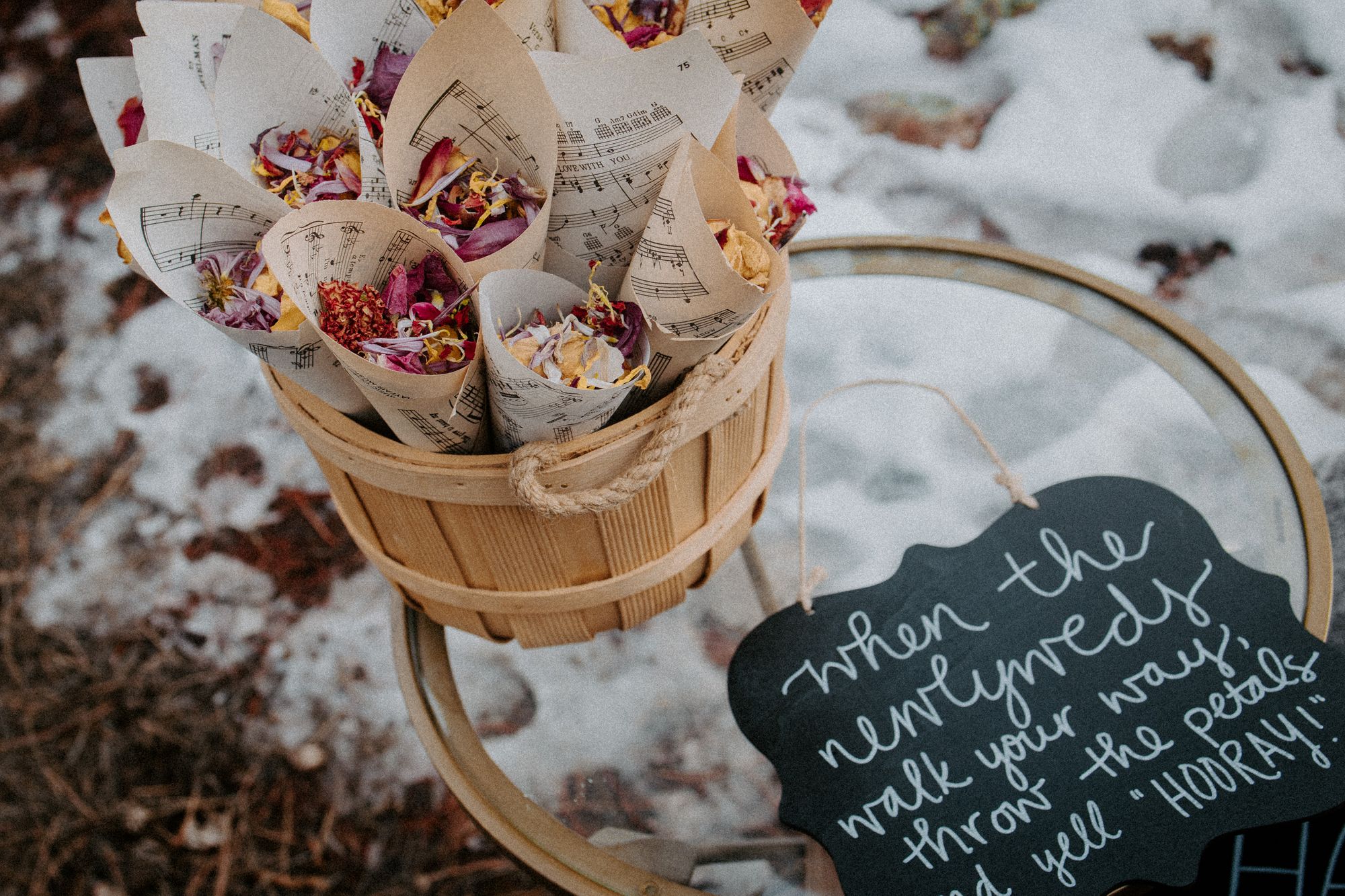 In the meantime, I bought music sheets from Goodwill’s book section and hand-rolled large paper cones. We filled these with all our dried petals the morning of the wedding.