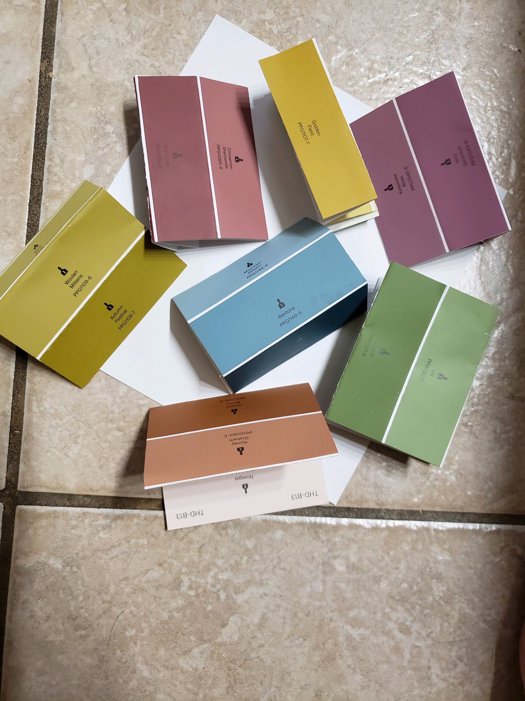 Taking my inspiration from Morocco (of course) and my Portuguese heritage, I ordered a variety of six 12x12 stencils and collected paint swatches from Home Depot.