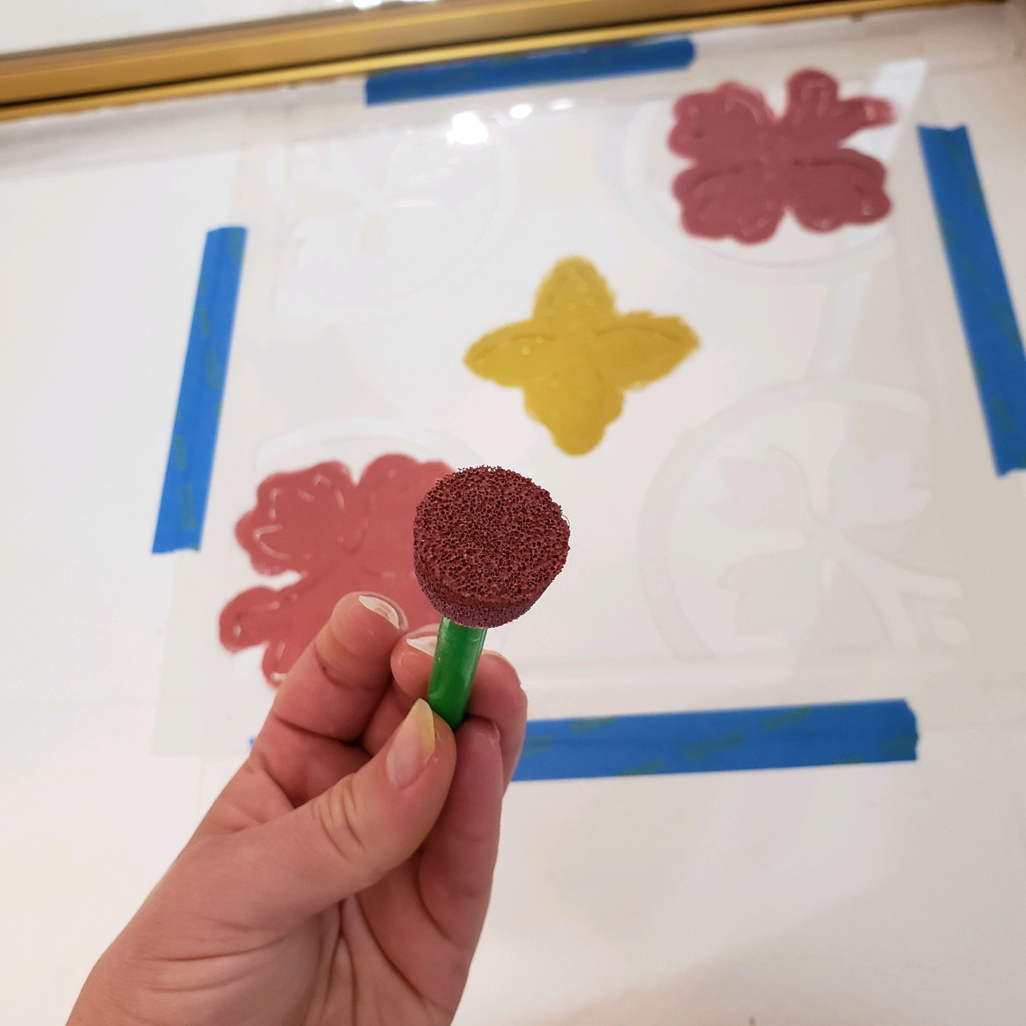 Then, using a paper plate to remove excess paint from my sponge brushes, I blotted meticulously, holding down the inner stencil edges as I went.