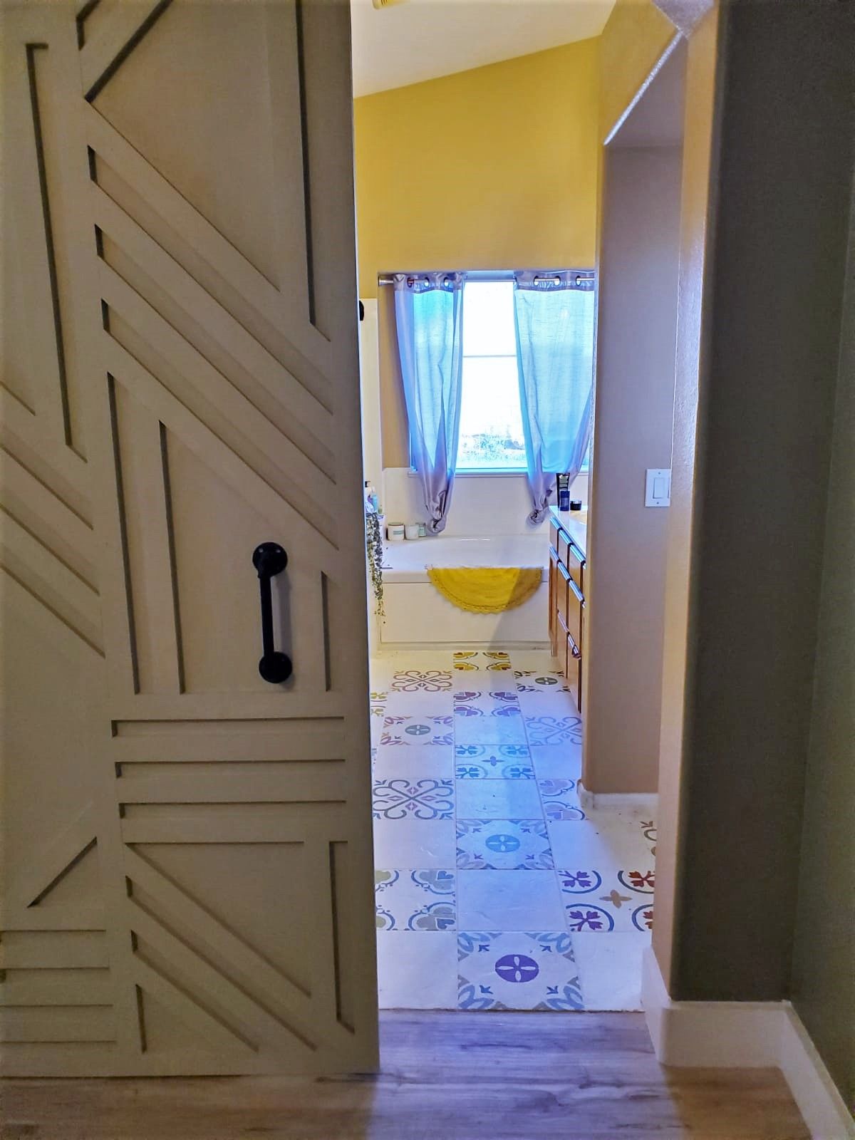 To save on time and money, I decided to paint and stencil the bathroom tile floors instead.
