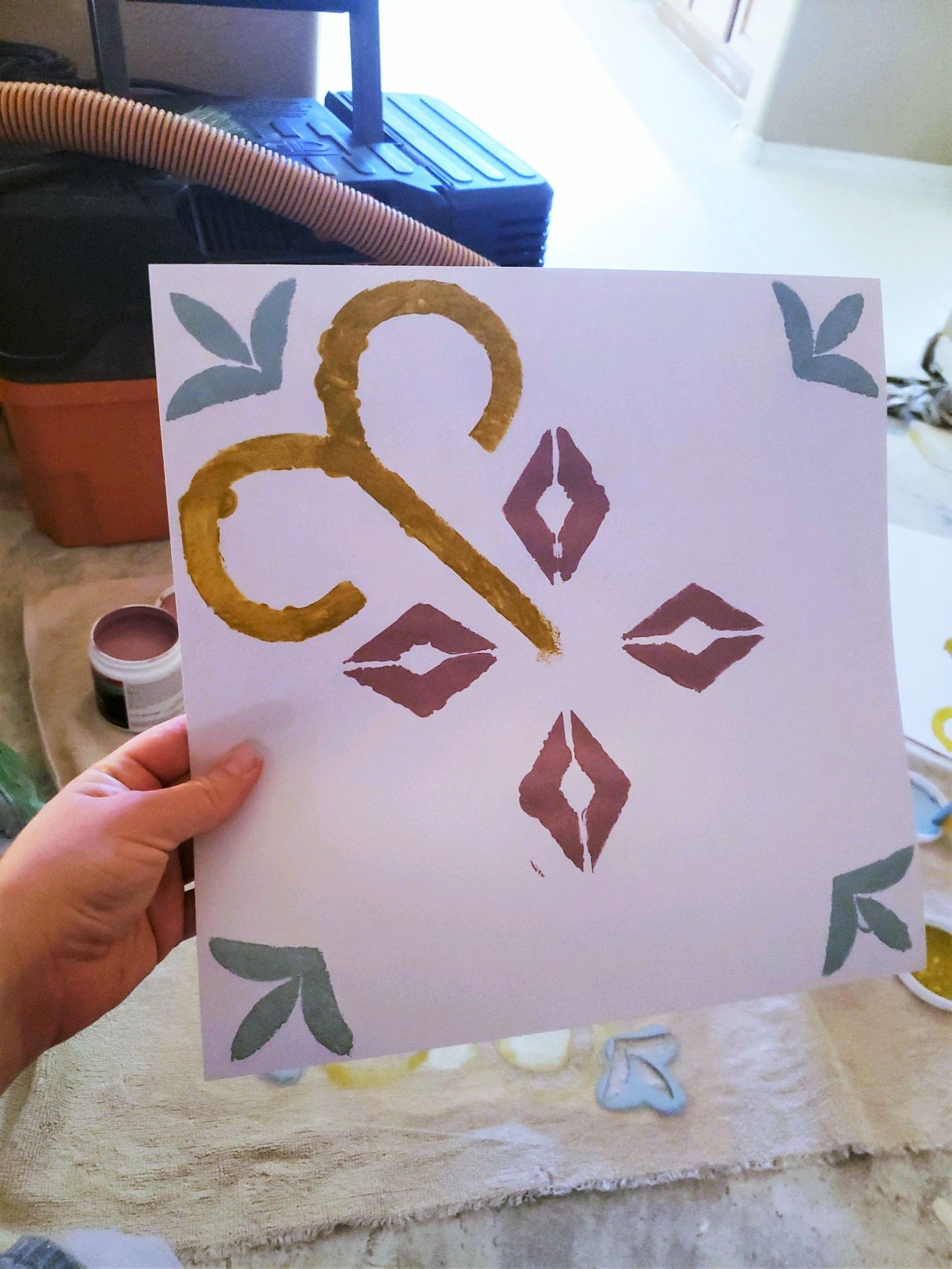 Using some scrap paper, I immediately began practicing with the stencils and color combinations. I wanted to hone some form of technique on paper before applying to the tile.