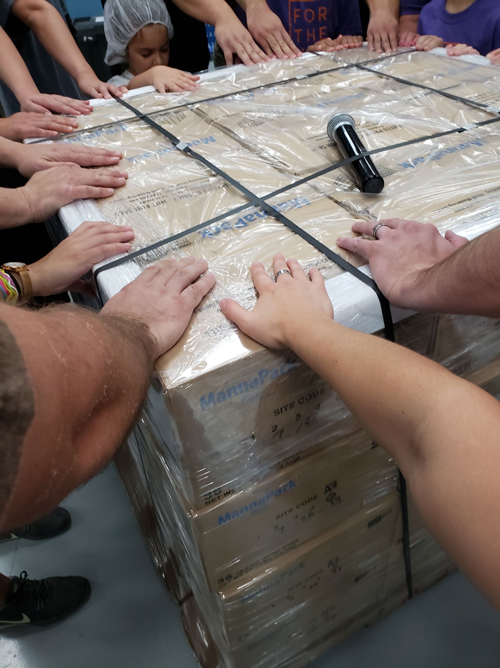 Staff keeps the energy high with fun tunes and healthy competition between packing stations. At the end of every session, volunteers are welcome to pray over the pallets to ensure safe delivery and good nourishment to the receivers.