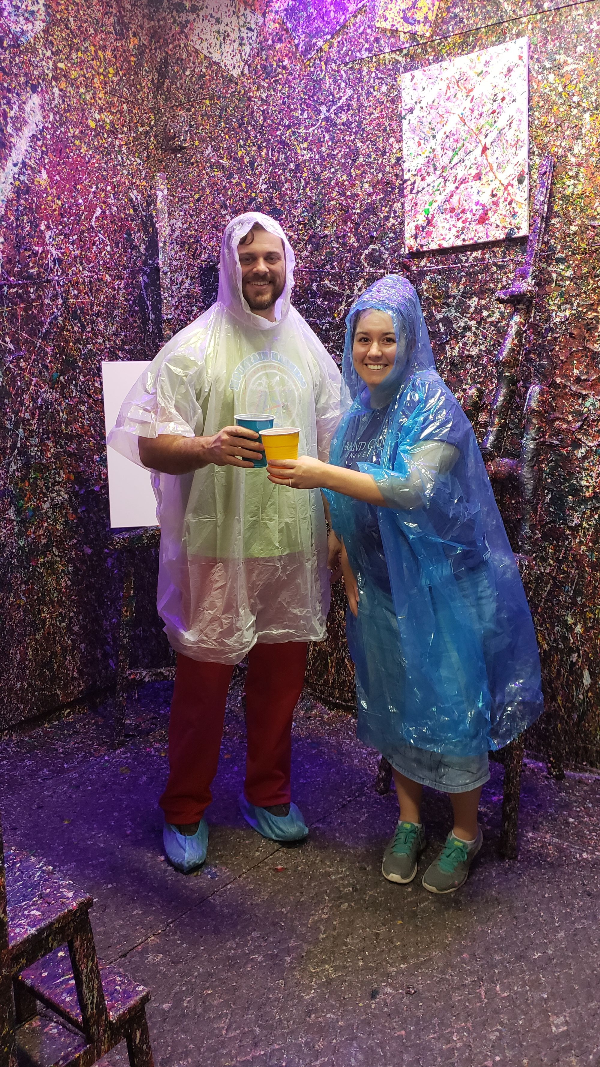 Our Groupon deal came with chocolates, champagne or fountain drinks, choice between two small or one large canvas, glow-up neon paint bonus, rain ponchos and booties, sole access to the Bluetooth speaker to play our own tunes, and a private 1-hour session in the paint splatter room to design our canvas.