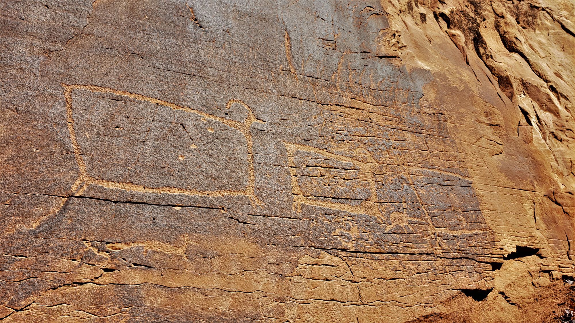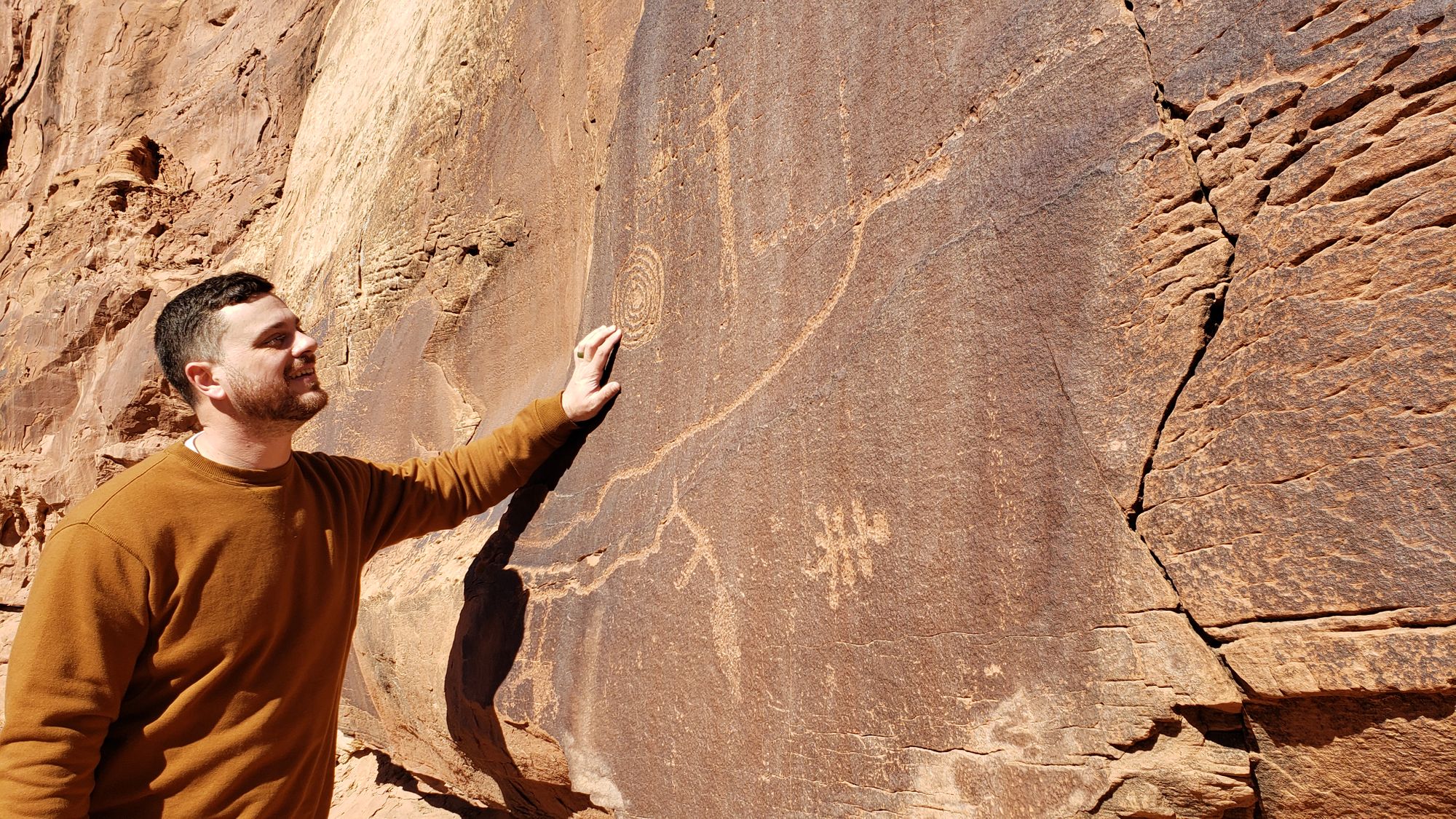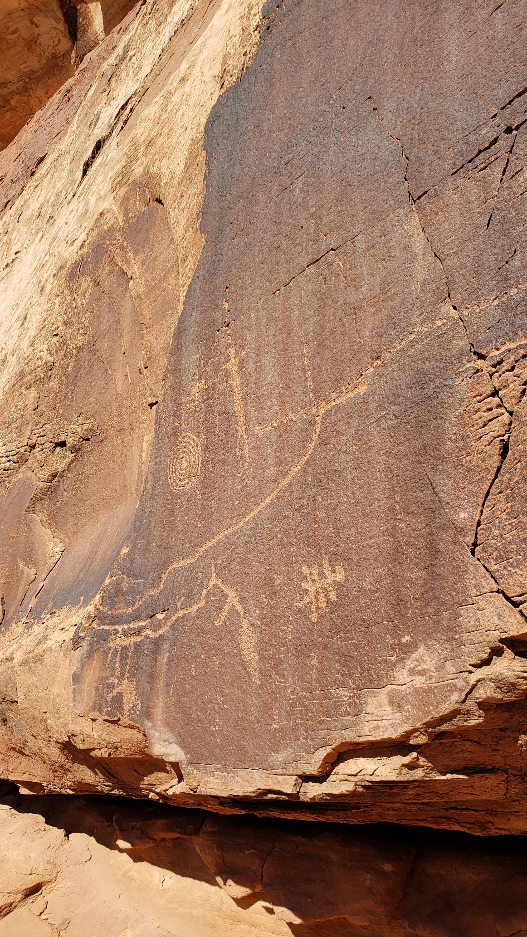 No, I didn’t name this Native American petroglyph. Located about 3 miles onto UT 313 from US Hwy 191, large carvings have been preserved along the rock face on the right side of the road. Take caution when parking and walking here, as it isn’t a formal site. Please be a cool human and don’t leave your own “art” or debris.