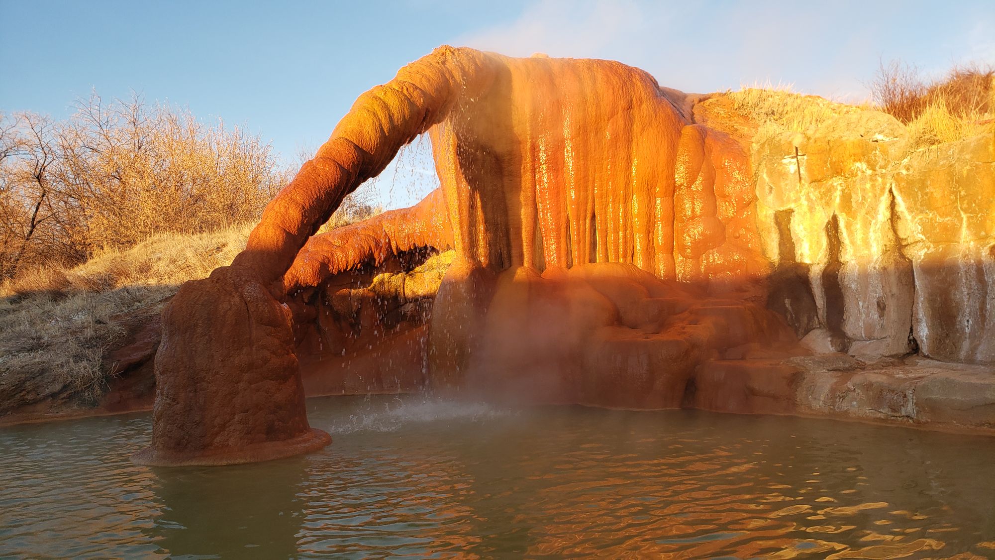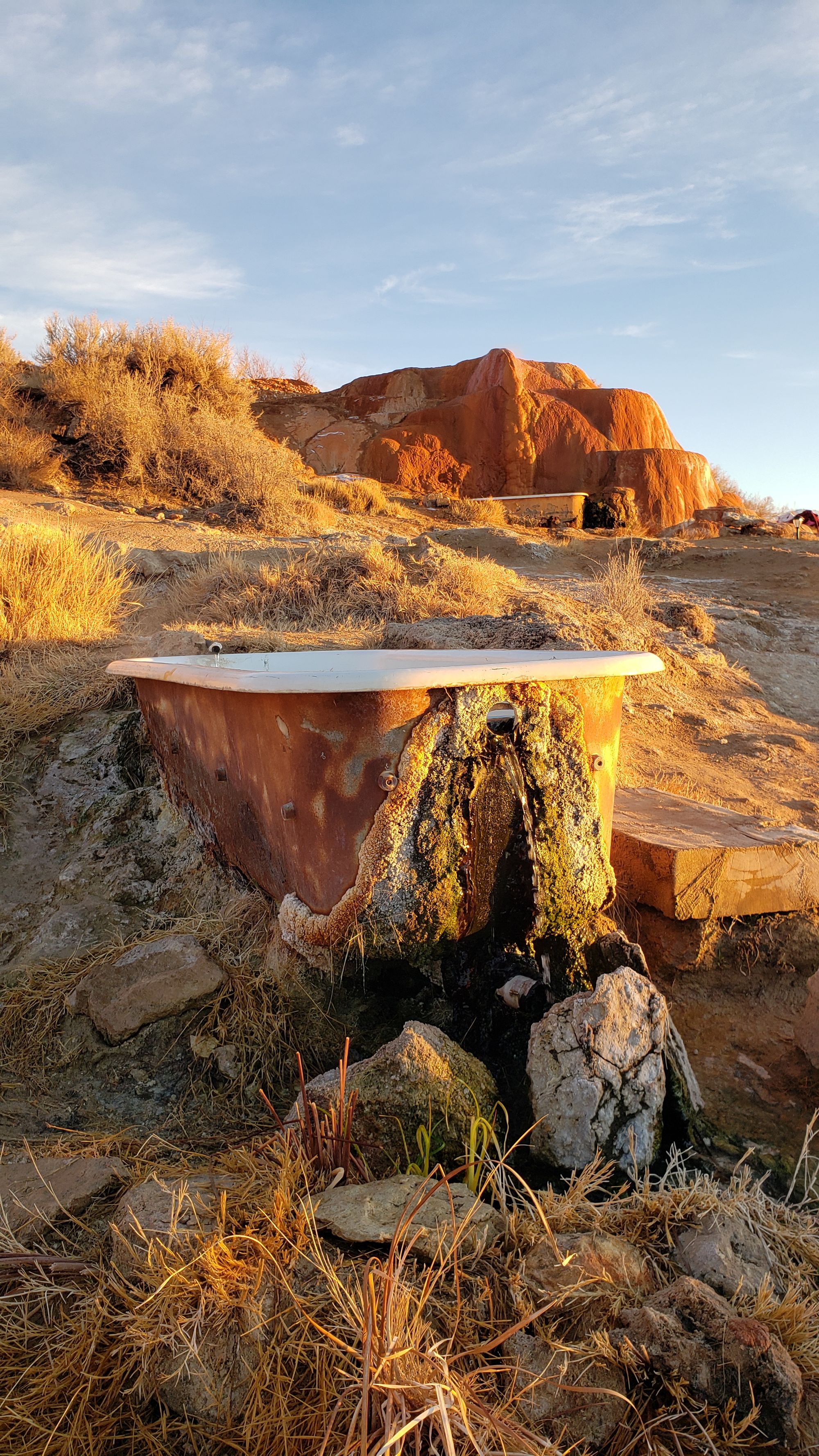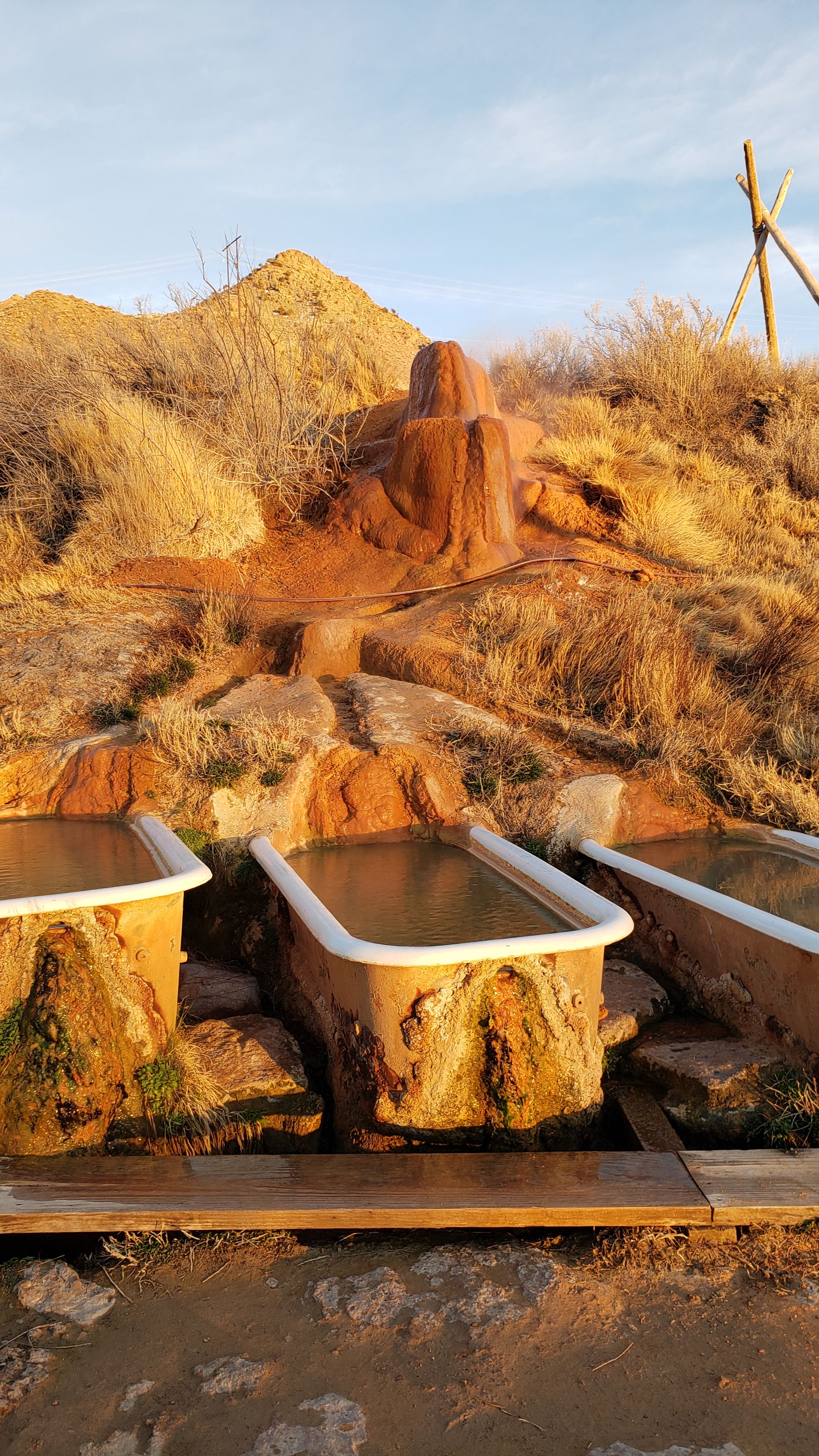 Rustic and unassuming, from the ducks casually wandering the lower level, to the 7+ primitive bathtubs encased in mineral deposits, down to the renovated school buses available for overnight stays, Mystic Hot Springs is a back-to-basics experience.